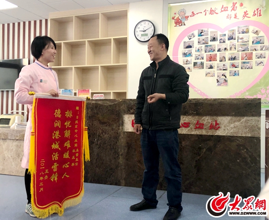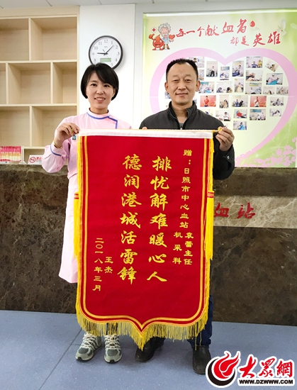 大众网日照3月28日讯(通讯员 王文艳)3月26日,阳光明媚、天气晴朗,日照市中心血站机采科的采血大厅依然是忙碌的,一大早,王杰先生带着满满的谢意怀抱锦旗而来,赠与机采科袁蕾科长。