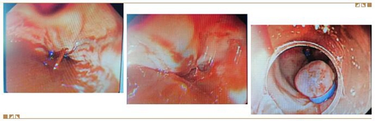 操作由胃肠肝胆学科部邢国辉医生执行,胃镜刚进入食管即见大量的鲜血,冲洗后露出多条面目峥嵘的曲张静脉,继续进镜至食管下段,即见一条粗大的静脉破裂,鲜血正从破口处喷射而出(左图),这时心电监护显示收缩压下降至70mmHg,心率达130次/分,病人已处于失血性休克状态,情况紧急,邢国辉当机立断,决定立即给予栓塞止血治疗,助手董磊娴熟的将组织胶粘合剂注入血管破口处,出血随即戛然而止(中图),整个手术过程不到3分钟。术后继续输液等治疗,患者心率、血压很快恢复正常,后期给予剩余的曲张静脉行胃镜下套扎治疗(右图),使曲张的血管消失,防治再次发生血管破裂出血。目前病人正在顺利恢复中。