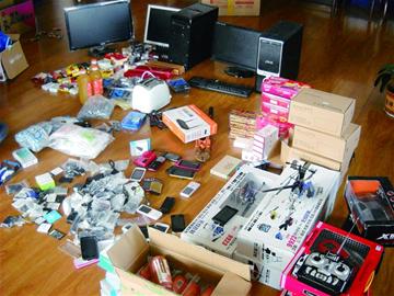 民警在现场查获电脑2台、显示器3台、手机15部、花生油3桶、香烟10余条、遥控玩具、路由器、食品、化妆品、电脑手机配件等物品一宗。