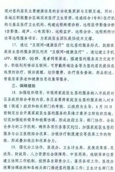 为保障家庭医生签约服务的顺利开展和实施,市级将签约服务纳入市政府对各区县综合考核内容,各区县将签约服务纳入对乡镇(街道)政府和相关部门的考;加强组织领导和统筹协调,形成政府主导、部门协作、全社会参与的工作机制,确保各项任务落实到位。