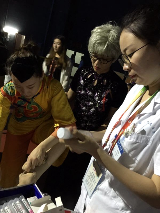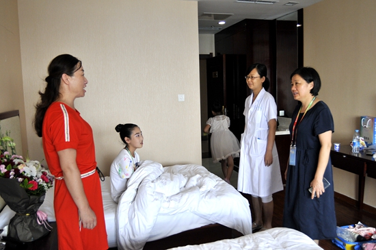 参加合唱节的队员都是10岁左右的孩子,最小的才4岁,并且来自全国各地,加之天气炎热,适应当地条件需要一段时间,这对医疗保障工作提出了更高的要求。7月18日9:00,负责怡景酒店保障的王美娇大夫还没来得及到房间,就接诊了一名来自辽宁合唱团的小女孩徐佳鑫,呕吐带血。王大夫跟随观察治疗至晚上19:2后转送市人民医院,医院第一时间开通绿色通道,给予针对性治疗,很快康复出院。7月19日上午,卫生保障组组长郑成香专程带保障医生前去复诊,关心徐佳鑫小朋友康复情况,带队老师和小朋友非常感激。7月18日20:58,负责君临天下大酒店医疗保障任务的林庆娟大夫接诊了一名摔伤的儿童,林大夫在给小朋友处理伤情后,第一时间联系合唱团带队老师,提醒小朋友们穿防滑拖鞋。