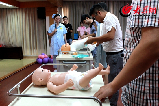 在给婴儿换纸尿裤环节,准爸爸们窘态百出,分不清正反、把模拟婴儿倒置过来……时不时引得台下观众捧腹大笑,现场气氛火热。
