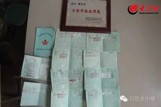 其实,柳廷贤所说的“事业”就是无偿献血。在卧室枕头底下,柳廷贤取出了一个塑料袋,袋里装着一个“日照市献血明星”的奖牌和一大摞红彤彤的无偿献血证。这些都是他的“宝贝”。