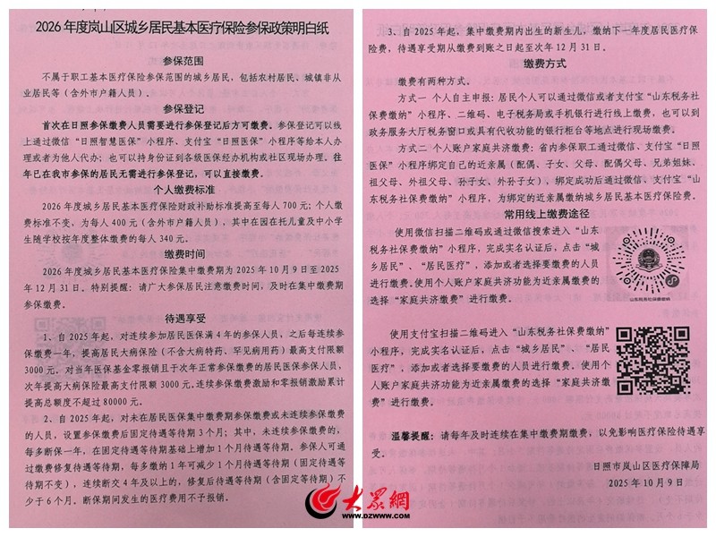 日前,记者获悉,2026年度城乡居民基本医疗保险集中缴费工作已正式启动。岚山头街道医保办温馨提示,集中缴费期为2025年10月9日至12月31日,请广大居民及时参保缴费,避免影响医保待遇享受。