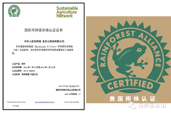 7月24日,日照圣谷山茶场115亩茶园获得由美国雨林联盟SAN认证颁发的国际可持续农场认证证书——雨林认证,是全国第十家获得该殊荣的茶企,在江北尚属首家。这标志着该公司茶园生态环境的可持续发展得到了国际认可,这也意味着圣谷山茶拿到了走向国际市场的“通行证”。