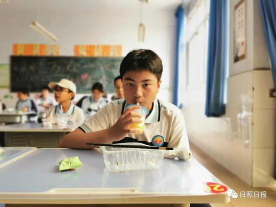 炒面、鸡腿、西兰花、粥,孩子们大快朵颐,认真地吃着饭。七年级一班的张颢,边喝粥边直呼“饭菜挺好的”。