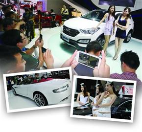 昨日上午,青岛国际车展开幕式一结束,聚集在各个入口的观众就争先恐后地挤进展馆一睹豪车芳容。劳斯莱斯、英菲尼迪、克莱斯勒、雷克萨斯等众多昔日难得一见的车型扎堆出现车展上,让观众们大饱眼福。记者在现场看到,在聚光灯的照射下,伴随着现场动感的音乐,靓丽的车模从后台鱼贯而出,站到各自推介的车前摆起POSE。美女车模向来是车展最吸引人眼球的焦点,她们一亮相就被无数的“长枪短炮”瞄准,现场的闪光灯和快门声响成一片。