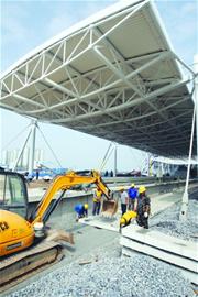 昨天上午,记者来到青岛北客站的工程现场,工人们正在分工忙碌着。 “主站房的整个屋面系统分为铝镁锰金属屋面、玻璃天窗、阳光板采光带、檐口铝板和天沟,这些都是同步施工的。 300名工人用了一个半月的时间,刚刚把金属屋面底板铺装完成,接下来会用近两个月的时间铺装屋面的中间层和面板。”施工方中建钢构的一名工程师介绍说,主站房的工程主要包括涂料施工、屋面工程、幕墙工程和内部装饰,目前涂料施工已经完成,幕墙的龙骨支架也已搭建好,下一步将安装玻璃。 “内装包括吊顶、高架候车层装饰等项目,也需要精工细作。”工程师表示。