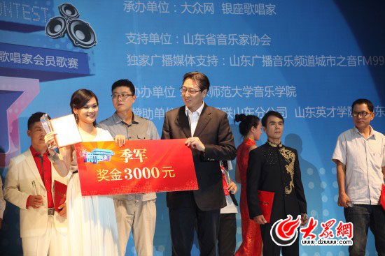 比赛结束,山东省委宣传部副部长、山东省网络文化办公室主任刘致福,大众报业集团党委常委、副总编辑杨晓洲,山东省文联副主席、省音乐家协会主席张桂林,山东大众传媒股份有限公司(大众网)董事长、总经理林忠礼共同为山东省第三届网络歌手大赛揭幕。大众网对比赛进行了全程卫星直播。有兴趣的网友可随时登陆大众网,继续关注山东省第三届网络歌手大赛的最新动态。