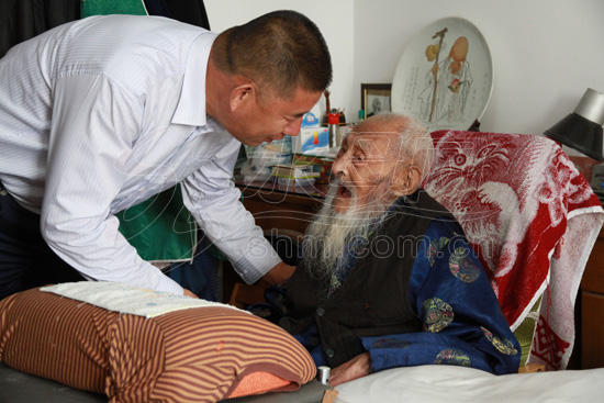 “老大爷,我又来看你了,还记得我吗?”毓璜顶街道工作人员彭守业拉着老人的手说,但老人家丝毫没有反应。老人的侄子杨玉兴解释说,老人现在耳朵背了,一般人说话他听不见。杨玉兴把嘴凑近老人耳旁,大声地说:“这是每年都过来看你的彭主任。”尽管耳朵不好使,但老人心里并没糊涂,他很快记起了眼前这位年轻人。“您今年多大岁数了?”彭守业逗老人说话,117岁的杨明运老人费劲地张嘴大声说:“我不知道,我是光绪年间生的。”老人一直记着自己是光绪年间出生的。