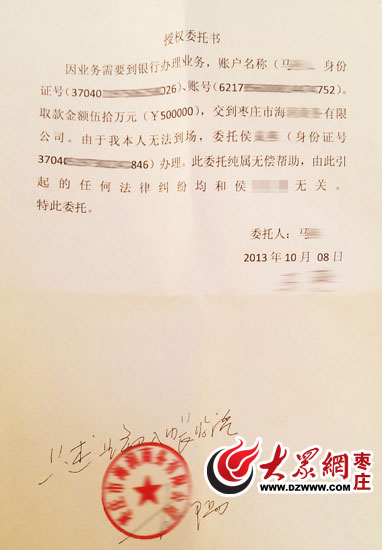 对于侯女士提出的取款手续“合法化”要求,建华路支行于10月11日、12日召集银行卡持有人,与侯女士补签了三份代取的业务授权委托书。签字时,侯女士发现,授权书中的收款公司是枣庄XX商务有限公司,和10月8日转入公司的名称不一致,而且签字日期是业务发生的10月8日,这让侯女士心中再起疑云,在她一再要求下,分行提供了三位授权委托人的身份证复印件。