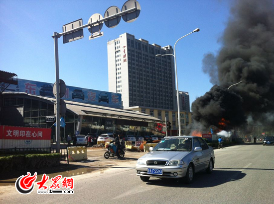 大众网济南10月15日讯(记者 尹海洋)今天上午,济南工业南路一4S店门前突发大火,黑烟滚滚,火势很大,消防队紧急赶到正在救援。