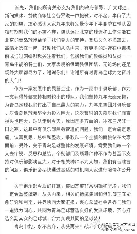 作为一家发展中的民营企业,作为一家中小俱乐部,作为一支获得外部支持相对较小的球队,我们坚持九年无怨无悔,为青岛足球我们付出了自己最大的努力。九年来集团对俱乐部,对青岛足球倾尽全力投入巨大,这次暂时的失落对我们而言损失也巨大,球队走到今天,原因是多方面的,冰冻三尺非一日之寒,这其中有俱乐部自身管理的问题,我们一定会痛定思痛,认真反思,总结和整改,争取以一个全新的面貌站在大家面前。另外,关于青岛足球整体的发展环境,需要我们每一个人去审视,反思和总结,人别部门及领导种种不为人知,我们有苦难言的问题,俱乐部会尽快通过合适的时机向大家进行澄清和公开。