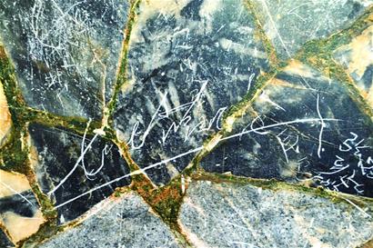 “花石楼一楼的滑石墙壁上有很多涂鸦,真是太影响美观了。”市民赵女士拨打早报热线82888000反映说。昨天上午,记者来到位于山海关路和紫荆关路附近的花石楼内,看到一楼几个房间的墙壁大部分都用滑石装饰了起来,不少参观的游客则在滑石旁边合影留念。不过,光滑的滑石上面却出现了划痕。记者仔细观察发现,这些划痕实际上是一些游客的涂鸦,涂鸦的内容则五花八门,基本上都是“小双、小珊”、“到此一游”、“刘某某我爱你”等内容。记者粗略数了一下,类似的涂鸦总共有近100处,有中文也有英文。