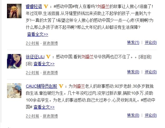 在微博上,很多网友也被刘盛兰老人的大爱所感动。“王蔚娜Diana”盛赞:刘盛兰用微薄的力量撑起多少学子的求学梦。大爱无边。“主持人小易”说:刘盛兰老人的事迹感动了我,他本应该是被帮助的人。大爱无疆!愿安度晚年!“Cherish-琪”:“看今年的感动中国,被这个叫刘盛兰的爷爷感动,或许奉献爱心真的不是一定要在物质上付出多少多少,而是尽自己的力量,持之以恒,看到那支满是伤口的手,会提醒自己,要把爱心行为继续下去,积少成多谁又能说这不是一股大力量呢加油~好心人还是很多的”