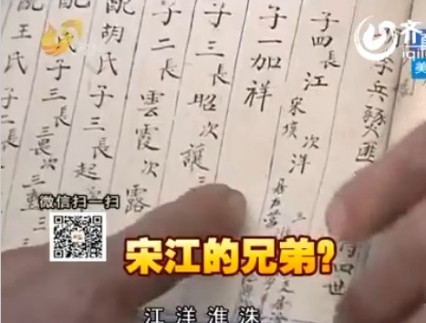 为了证实自己的说法,村民们拿着家谱让记者看,有宋江的父亲,宋江弟兄四人,名字分别是“江洋淮洙”。