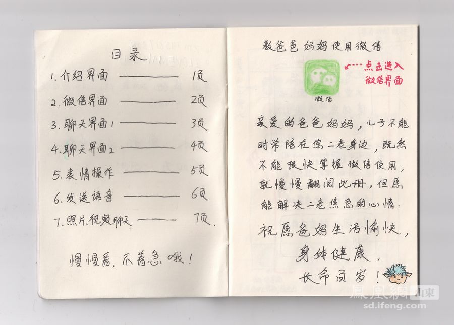 下面是张明写给爸妈的祝福语:“亲爱的爸爸妈妈,儿子不能时常陪在您二老身边,既然不能很快掌握微信使用,就慢慢翻阅此册,但愿能解决二老焦急的心情。祝愿爸妈生活愉快!身体健康,长命百岁!”