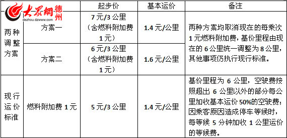 初步拟定及在会上讨论的方案分别是:方案一,提高起步价标准,由现在的6元/3公里(含燃料附加费1元)调整为7元/3公里;基本运价1.4元/公里保持不动。方案二,起步价标准保持现在的6元/3公里(含燃料附加费1元)不动;提高基本运价标准,由现在的1.4元/公里调整为1.6元/公里。两种方案均取消现在的每乘次1元燃料附加费,基价里程由现在的6公里统一调整为8公里,其他事项仍执行现行标准。