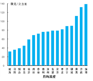 2月份,细颗粒物浓度最好的城市是威海,为47μg/m3,最差的城市是菏泽,为136μg/m3;同比均改善,改善幅度最大的城市是聊城,为44.8%,改善幅度最小的城市是泰安,为11.0%。