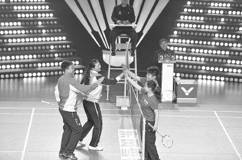 “谁是球王”赛场上,国羽名将张宁、董炯与中国残疾人羽毛球队队员互动。