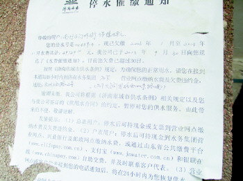 记者看到,4单元门口贴着多张水务集团的“停水催缴通知书”,通知书上显示,4单元自2006年1月至2013年11月,就没有缴纳过水费,共拖欠水费近5万元,催促居民早日去缴水费。
