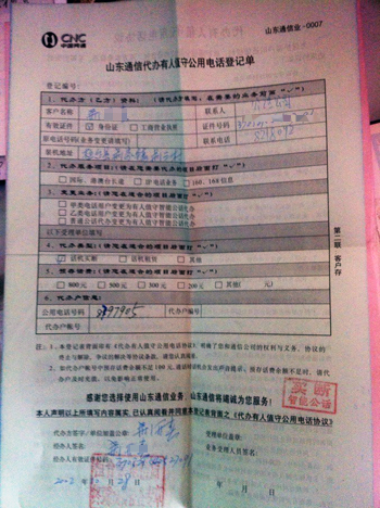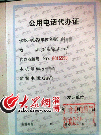 图为荆先生提供的联通公司为其开具的公用电话代办证。
