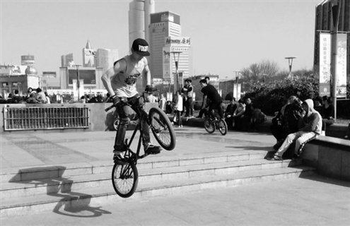 泉城广场,洒满阳光。在一片叫好声中,一群年轻人骑着小型自行车上台阶、骑跳,做出各种花式动作,惊险中却又如此炫目。这种运动的专业称呼是“自行车越野”(英文简称BMX),产生于上世纪70年代的美国,现在在世界范围内流行,特别是在年轻人中,被认为是一种“很酷”的运动。文/图记者陈心如 林彦银