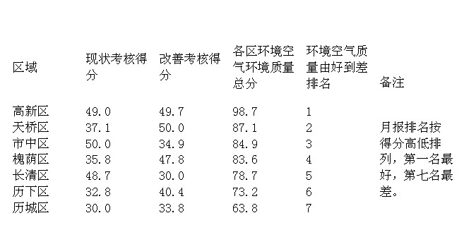 据介绍,济南各区共设有15个空气环境自动监测子站,每个区都有2-3个监测点位,历城区面积大,有4个,高新区和长清区各有1个。考核指标是PM10、PM2.5和SO2(二氧化硫)3项大气污染物浓度值,其中扬尘比重最大,达到40%。现状分依据各区这3项大气污染物的月均浓度值高低打分,改善分则是把当月污染物浓度值与去年同期作比较后计算得出。