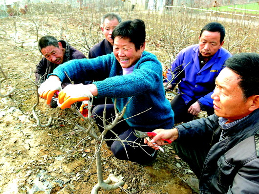 ▲莱芜杨庄镇闫桥村村民在学习剪枝技术。通过土地流转,村里建起苗木基地,该村的土地产权制度改革也提上日程。