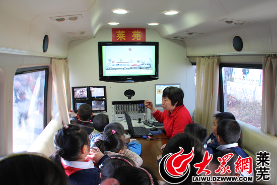 移动气象台工作人员为参观小学生讲解天气预报流程(记者 亓秀宝 摄)