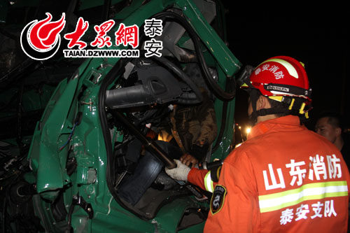 3月24日4时25分,泰安市公安消防支队新泰中队接到支队指挥中心指令称:位于G205国道新泰与莱芜交界处发生一起交通事故,有一人被卡在驾驶室,接到命令后,中队立即出动赶赴现场处置。