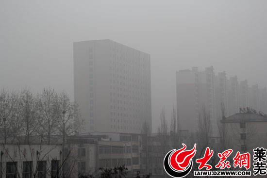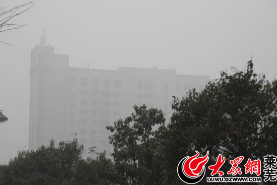 莱芜市文化北路市委党校段,百米外建设大厦模糊不清(记者 亓秀宝 摄)