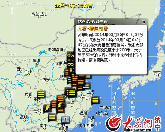 大众网济宁3月26日讯(记者 高杨)从今日凌晨开始,济宁市大部分地区大雾弥漫,部分地区能见度仅50米左右。济宁气象台发布大雾橙色预警信号,部分高速路收费站入口因大雾也暂时封闭。