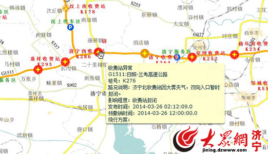 此外,记者还了解到,因大雾 G1511日照-兰考高速公路济宁西收费站、济宁北收费站、兖州收费站、曲阜南收费站、泗水收费站等部分济宁境内收费站入口于今日凌晨2点左右暂时封闭,预计撤销时间是今日中午12时。