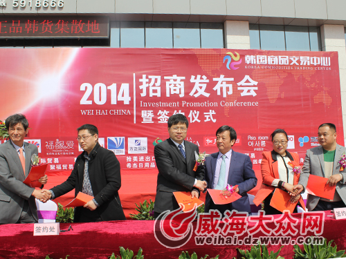 记者从招商发布会现场了解到, 当天韩国商品交易中心共签约入驻30多家进出口企业,商场签约率达85%。威海九日进出口有限公司是当天签约的企业之一,该公司负责人表示,威海是中国距韩国最近的城市,中韩第一条海上航线在1990年就开通了,“韩流”也是从威海吹向全国的。不过,随着其他港口的开放,威海面临着青岛、烟台、天津、上海、大连、连云港等城市的剧烈竞争,企业也经受了了残酷的考验,韩国商品交易中心无疑为企业在市场竞争中占据优势添了动力。