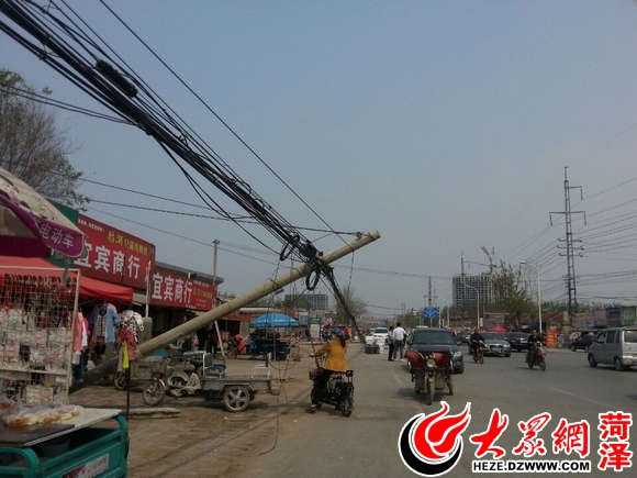 今天上午,大众网记者在牡丹南路菏泽生建机械厂路段看到,从根部断裂的四根线杆横七竖八地倒在路边。