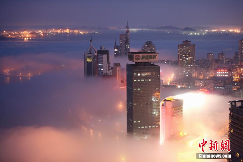 4月2日傍晚,青岛市前海一线出现平流雾美景,夜色中的城市建筑被浓雾缠绕,若隐若现,宛如仙境。平流雾是暖湿空气移到较冷的陆地或水面时,因下部冷却而形成的雾气。青岛地区多在春季发生,范围大,雾较浓,厚度较大,有时可达几百米。中新社发 徐崇德 摄