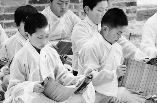 尼山书院门前西侧现场设置了礼、乐、书三大功能区。祭孔礼成后,在“礼”功能区,十余名女子身着古装向人们展示拜师礼、婚礼等传统礼仪;在“乐”功能区,同样是十余名身着古装的乐师在演奏中国传统礼乐;在“书”功能区,二十名七八岁的孩子跟着老师大声诵读《论语》。
