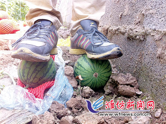 为了验证瓜皮的硬度,杨树峰拿出了其中两个“铁皮西瓜”,记者两脚踩上去,西瓜还完好无损。