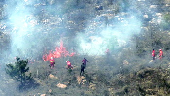 5日13时许,在青岛崂山区一处失火山体上,消防官兵正在扑灭明火。 (杨广帅 摄)