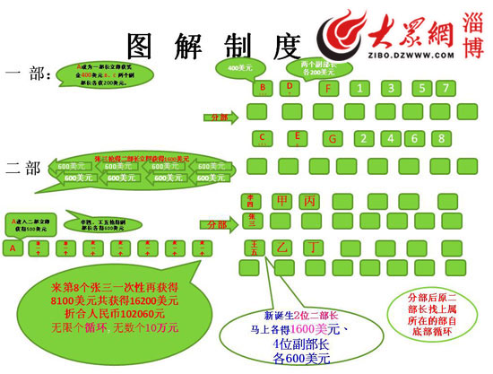 桓台经侦立刻布控摸查,经发现王某某、史某某的上线刘某以销售青岛日用品有限公司保健产品的名义发展会员。桓台民警发现,此人以发展人员购买该公司产品为由,以积累到600pv成为该公司“合格消费商”引诱,发展大批会员加入组织。经调查发现,该组织规定严密,分红制度详细,据了解,成为该公司“合格消费商”后,可根据推荐的人数和快慢抢得晋升为一部副部长、部长、二部副部长、部长的机会,并根据层级位置分别获取400美元、500美元、1600美元、16200美元、销售奖、领导奖、分红、车房福利奖等各类返利。