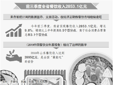 吃,是旅游六要素之一。今年发布的《2019中国餐饮业年度报告》给出了这样的数字:2018年山东餐饮收入达到3995亿元,是全国“最能吃”的省份。来自省统计局的数据显示,文旅活动、夜经济正助推餐饮市场继续走旺。今年前三季度,我省实现餐饮收入2853.1亿元,增长9.8%,增速比上半年提高0.5个百分点,高于社会消费品零售总额3.1个百分点。