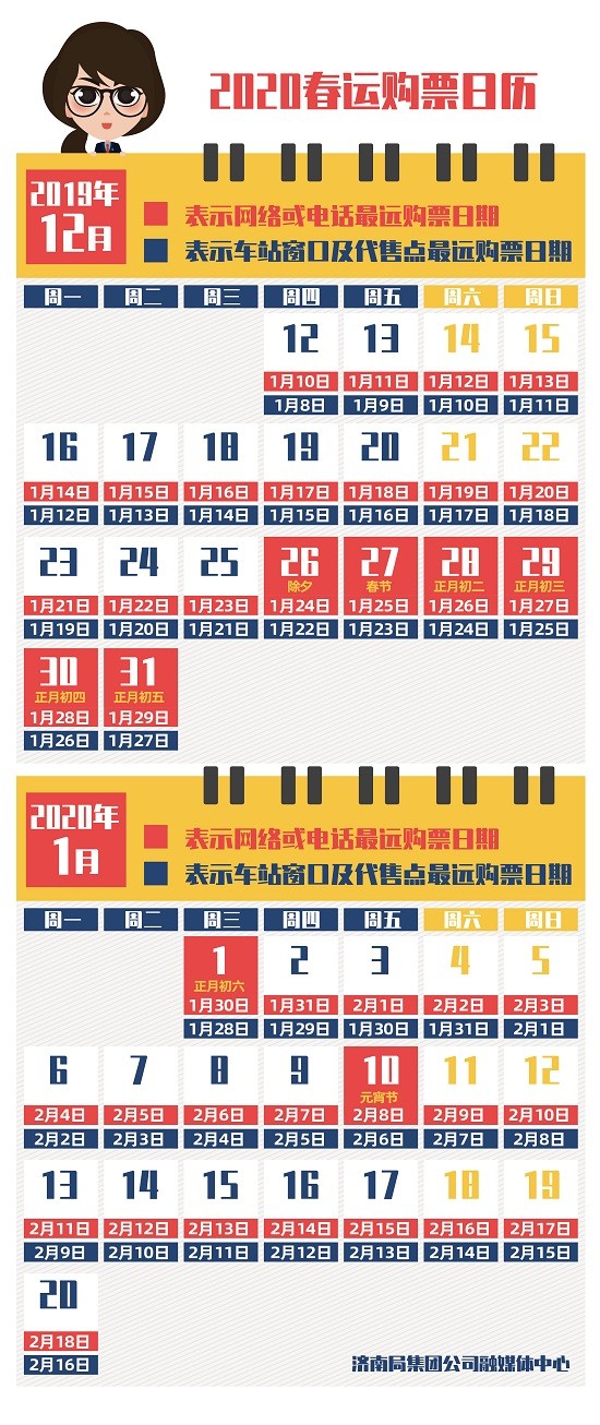 此次春运从2020年1月10日至2月18日,共计40天。铁路部门预计,节前学生流、务工流、探亲流高度重叠,客流相对集中,节后客流相对平缓。中国铁路济南局预计发送旅客1715万人,同比增幅7.5%。