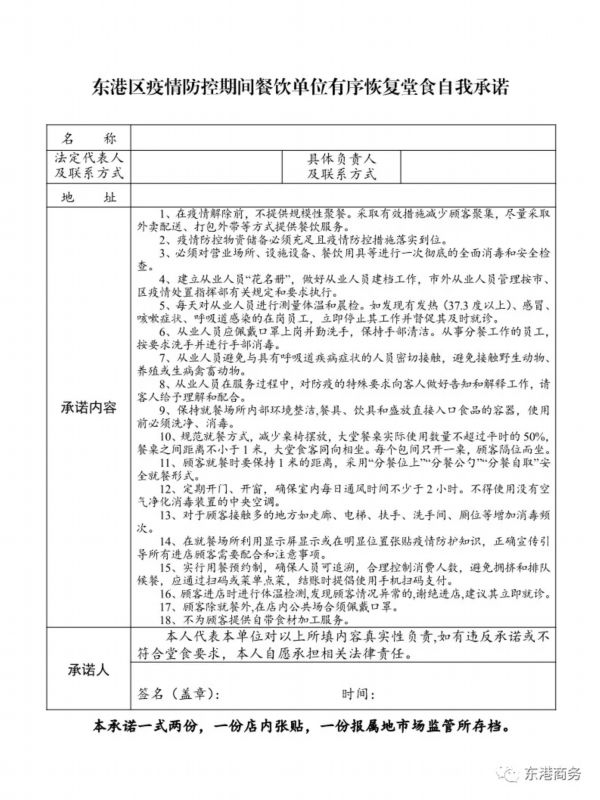 二、疫情防控措施落实到位且达到相关要求的餐饮单位作出承诺后可恢复堂食。